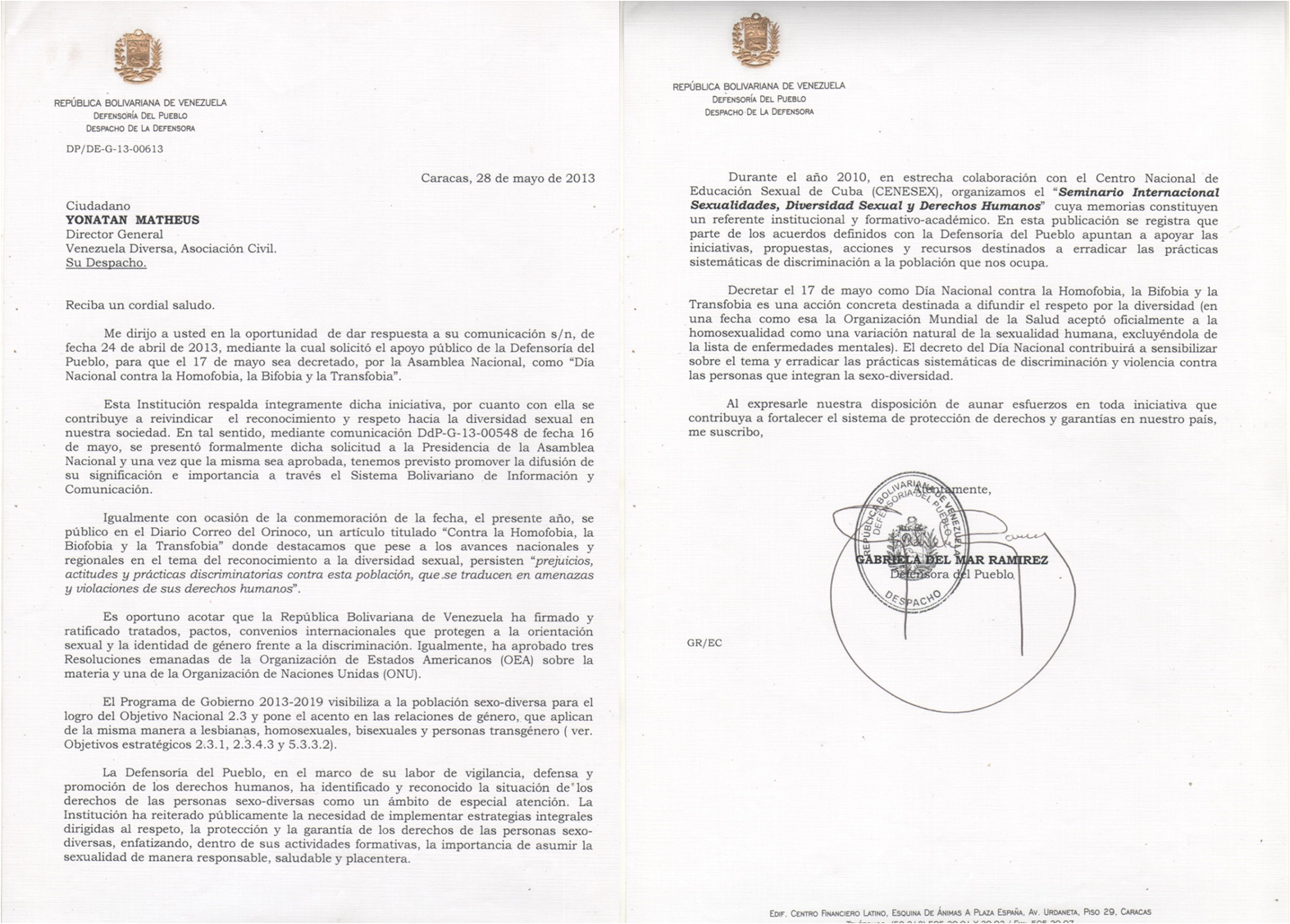 Se entrego la solicitud de decreto del 17 de mayo como Día Municipal contra la Homofobia, Bifobia y Transfobia al Municipio Bolivariano Libertador: Cocejal Carmen Zerpa y Rozaida Hernandez, sin recibir respuesta.
